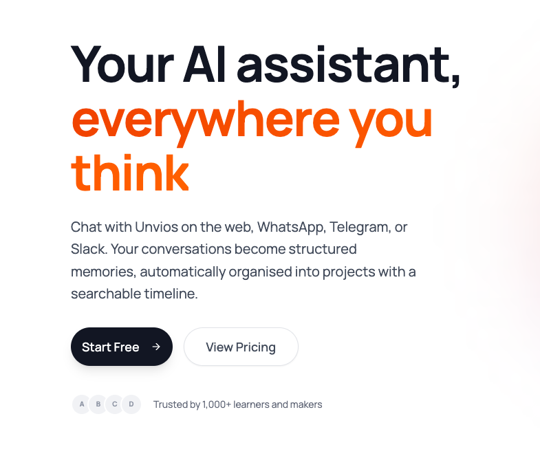 Chat with Unvios on the web, WhatsApp, Telegram, or Slack. Your conversations become structured memories, automatically organised into projects with a searchable timeline.